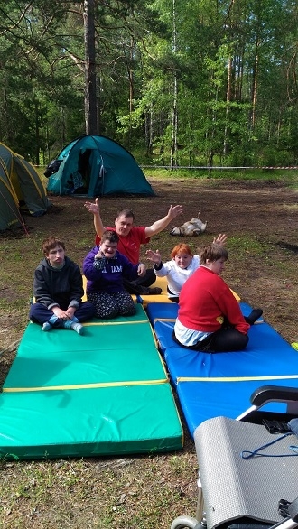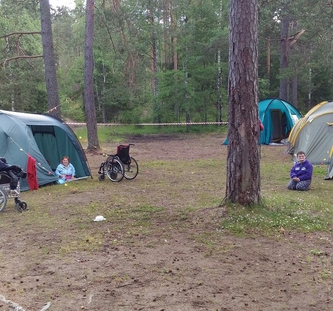 Лагерь был разбит между двух озер, в очень живописном месте. Вокруг лагеря - сосновый бор, море черники. Ребята жили в палатках, спали днём на воздухе, катались на надувной лодке, купались, собирали чернику и хворост, помогали повару готовить еду, по вечерам пели под гитару у костра, в общем, это было настоящее лето. Организацией лагеря и его функционированием занимался руководитель лагеря, сотрудник СПб БОО "Перспективы". В его обязанности входило: организация строительства лагеря, подготовка к каждой смене ребят, организация демонтажа лагеря, руководство деятельностью лагеря внутри каждой смены, закупки, подсчет остатков продуктов, полная финансовая ответственность. Летний палаточный лагерь был организован в три смены: 1 смена – с 7 по 11 июля, 2 смена – с 14 по 18 июля, 3 смена – с 21 по 25 июля. В каждой смене 7 ребят (всего 21 человек, из них 6 на колясках) и 8 сопровождающих (6 сопровождающих + 1 инструктор АФК + 1 медсестра-штатный работник интерната). Среди отдыхающих были как дееспособные, так и недееспособные. В бюджете лагеря молодые люди участвовали своими пенсионными деньгами. Для недееспособных деньги заказывались у социального работника отделения, дееспособные отдавали деньги самостоятельно. Активно использовались продукты питания от интерната, выданные в виде сухого пайка. Основная часть бюджета была обеспечена благотворительными пожертвованиями, сбором которых занимался отдел фандрайзинга БОО "Перспективы". Сопровождающих было больше чем подопечных, так как каждый день из числа сопровождающих назначались двое дежурных по лагерю. Был составлен график дежурств. Обязанности дежурного: приготовление еды, пополнение запасов питьевой воды, (горячей и холодной, плюс воды для бытовых нужд), дров, поддержание костра, стирка вещей, ночное дежурство (помощь ребятам в туалете). На следующий день те, кто дежурил, приступали к работе с 15-00. Рабочий день в лагере с 8-30 до 22-00. Это 13,5 часов. Из них 7,5 часов являются рабочим временем сотрудника. Оно табелируется координатором. Все, что свыше 7,5 часов, является переработкой. Именно это время включено в штатное расписание по лагерю. Фандрайзинг в том числе ищет средства на оплату сверхнормативного времени сотрудников. Реальная сумма за переработки получилась довольно большая. Поэтому на совете координаторов с целью уменьшения расходов на лагерь были выработаны следующие схемы оплаты: часть переработок получить деньгами и часть отгулами. Каждому было предложено 2 варианта: "2 отгула за смену + 50% переработок" или "1 отгул за смену + 75 % переработок", т.к. кому-то важнее отгулы, а кому-то - деньги. Каждый сотрудник только один раз едет в палаточный лагерь (в одну какую-то смену). По два раза никто не едет. Смены составлены таким образом, чтобы учесть отпуска сотрудников, и чтобы на отделении всегда в группе кто-то оставался. Постановка и размонтирование лагеря было сделано силами волонтеров безвозмездно. Всего этим были заняты 8 волонтеров. Среди сопровождающих было также 3 волонтера, которые работали безвозмездно. Общие затраты на лагерь составили 200 000 руб. Видеорепортаж о лагере 2014 г. можно увидеть на сайте телеканала "Союз". В 2015 году лагерь повторился, было уже четыре смены: рассказ, фотографии. А в 2017 г. палаточный лагерь был организован для жителей Дома сопровождаемого проживания.