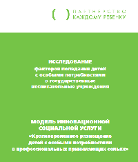 "Мы представляем Вашему вниманию исследование факторов попадания детей с особыми потребностями в государственные воспитательные учреждения и модель совершенно новой для России услуги кратковременного размещения детей с особыми потребностями в профессиональные принимающие семьи. Начав с деятельности по преодолению социальной исключенности детей с двигательными нарушениями, мы продвинулись к созданию инновационных социальных услуг для семей, воспитывающих детей с особенностями развития для предотвращения их попадания в интернатные учреждения". Брошюра доступна для скачивания на сайте АНО "Партнерство каждому ребенку". *** Брошюра посвящена двум основным темам: как поддержать семью с особым ребенком в целях профилактики социального сиротства или облегчения его семейного устройства; и как приблизить условия жизни ребенка в интернате к нормальным. Вопросы, какие изменения в законодательстве необходимы на федеральном и региональном уровнях, а также какие правоприменительные практики противоречат имеющимся правовым нормам, соответствующим Конвенции о правах инвалидов, исследуют специалисты СПб БОО "Перспективы совместно с опытными экспертами в вопросах прав людей с ментальной инвалидностью: Д.А. Бартеневым, членом Совета Адвокатской палаты СПб, к. юр. н., преподавателя кафедры международного права СПбГУ, важнейшим адвокатским успехом которого стало выигранное в Конституционном суде РФ дело, позволившее ввести в российское законодательство новый статус ограниченной дееспособности для людей с психическими нарушениями, и С.А. Колосковым, правозащитником, президентом родительской ассоциации "Даун-синдром, помощником первого заместителя председателя Комитета Госдумы РФ по образованию и науке, экспертом аппарата Уполномоченного по правам человека в РФ. Брошюра доступна для скачивания на сайте СПб БОО "Перспективы". В печатном виде есть в офисе СПб БОО "Перспективы". ***