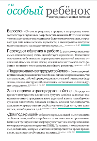 Издание посвящено разбору вопросов, возникающих при осуществлении опеки и попечительства совершеннолетних граждан, признанных недееспособными и ограниченными в дееспособности вследствие психического расстройства. Основой для книги послужило обобщение многолетнего опыта консультирования семей, в которых есть люди с психическими расстройствами, взаимодействия с органами власти, экспертной и законотворческой деятельности. В книге впервые предпринята попытка в максимально простой форме описать, как ограниченные в дееспособности и недееспособные граждане осуществляют свои права и исполняют свои обязанности, как следует действовать опекунам и попечителям, как обратиться в суд о признании недееспособным или ограниченным в дееспособности и как стать опекуном или попечителем. При этом приведены ссылки на имеющееся законодательство, учтен международный опыт. Особое внимание уделено вопросам, возникающим в связи с реализацией относительно нового для нашей страны правового института – ограничения дееспособности вследствие психического расстройства. Книга адресована родителям лиц с психическими расстройствами, опекунам и попечителям совершеннолетних граждан, сотрудникам органов опеки и попечительства, социальных служб, организаций социального обслуживания, некоммерческих и благотворительных организаций, занимающихся помощью людям с психическими расстройствами. Книга доступна для скачивания на сайте "Особое детство". Методическое пособие предназначено представителям НКО и родительских организаций, в которых реализуются программы сопровождаемого проживания или планируются подобные проекты. В издании собран и систематизирован опыт петербургской благотворительной организации «Перспективы». Брошюра доступна для скачивания на нашем сайте. Двенадцатый выпуск посвящен работе с взрослыми людьми, имеющими различные нарушения развития. Взросление ставит перед человеком и помогающими ему специалистами новые задачи – на первый план выходит подготовка к самостоятельной жизни, обеспечение условий для творчества и трудоустройства. Издание адресовано специалистам (педагогам, дефектологам, психологам, социальным работникам и т.д.), работающим с детьми, подростками и взрослыми, имеющими различные нарушения развития, семьям, в которых воспитываются особые дети и живут особые взрослые, и также всем, кто интересуется данной проблематикой. Разделы сборника: Взросление, Исследования, Практический опыт, Профессиональная ориентацитя и работа, Подготовка к сопровождаемому проживанию. Книга доступна для скачивания на сайте "Особое детство". *** *** Зачем работодателям нужны сотрудники с синдромом Дауна или другими ментальными особенностями? Как наладить общение с такими людьми и какую работу можно поручить им? Кто такой куратор-наставник и как он может помочь человеку с ментальными особенностями адаптироваться на рабочем месте? Куратор-наставник сотрудника с ментальной инвалидностью это пока новая профессия для российского рынка труда. И руководству, и сотрудникам организации, принявшей на работу такого человека, порой не хватает опыта и специальных знаний, чтобы создать необходимые условия труда сотруднику с синдромом Дауна и правильно с ним взаимодействовать. Пособие, созданное экспертами Даунсайд Ап, адресов